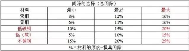 請(qǐng)參照下表選擇模具間隙(表中數(shù)據(jù)為百分?jǐn)?shù))